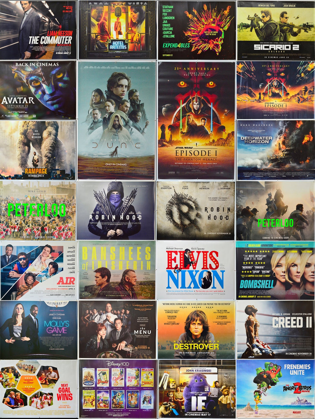 For fans of action and thrillers, the collection includes posters for Expend4bles (Expendables 4), Sicario 2: Soldado, The Commuter (starring Liam Neeson), Robin Hood (2018, with Taron Egerton), and Rampage (featuring Dwayne Johnson).