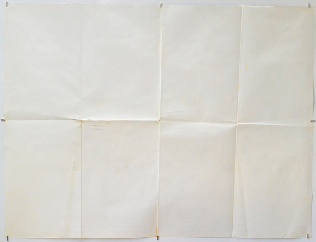 Numerous small faint fine Brown spots of damp (foxing) on and around both side edges including a 3 x 2 cm patch at the center of both side edges, numerous additional faint Brown spots of damp (foxing) throughout the bottom two corner fold segments. 10 cm diagonal crease across the bottom right corner, a couple of extremely tiny tears and extremely mild creasing on the bottom edge, 3 x 1 cm slightly darker patch of Browning at the bottom of the center vertical fold line, slightly diagonal fold line from the left fold intersection down to the bottom edge and another across to just above the center of the left edge and two similar diagonal folds from the right fold intersection (there are some light Brown spots of damp on and around these fold lines), light crease between the left and center vertical fold lines (just above the center horizontal fold), light creasing to the bottom left corner, three tiny light blue print error spots in the dark blue near the top of the right vertical fold line, extremely mild fold wear, otherwise good.Double Sided :
