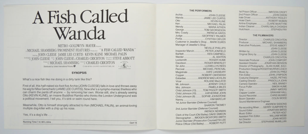“A Fish Called Wanda” Original Cinema Exhibitors Press Synopsis / Credits Booklet (UK)