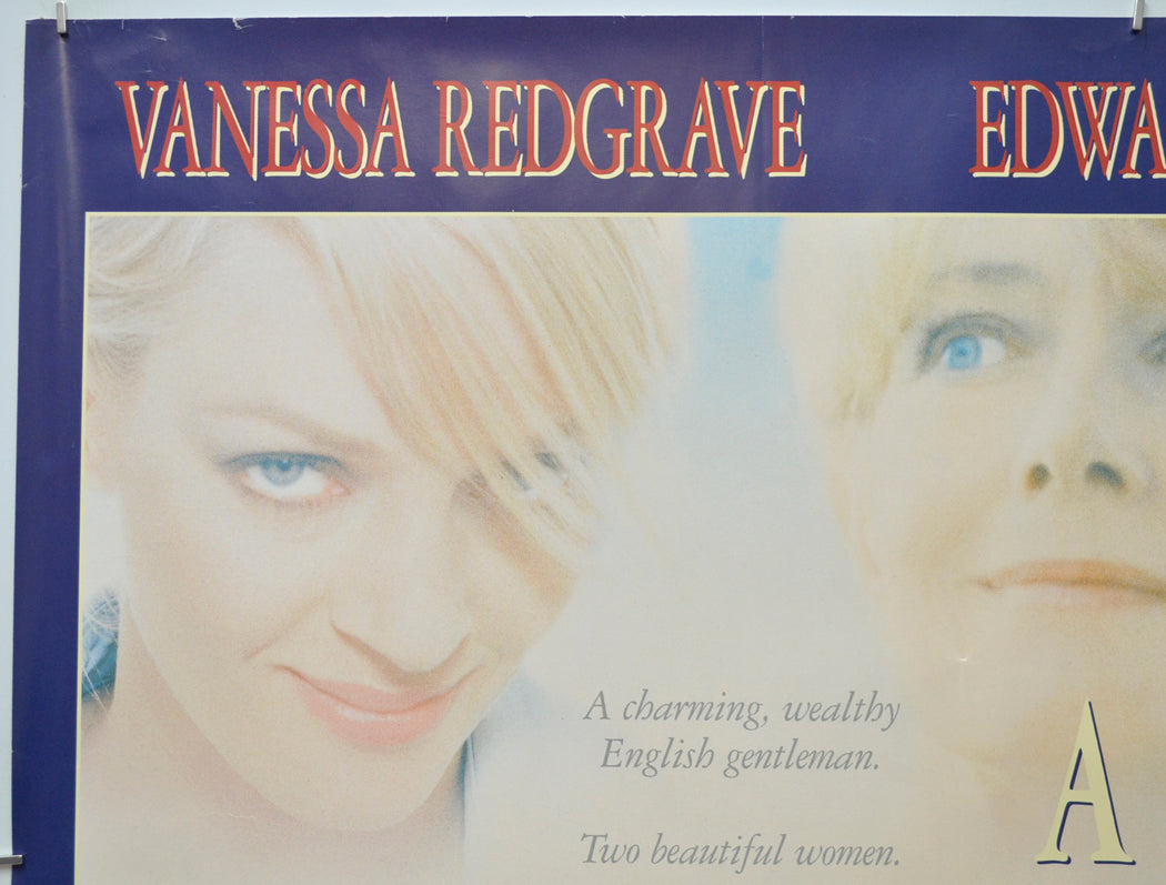 Tiny piece torn from the tip of the top left corner, two small tears and mild/moderate creasing on the top edge including three 4 cm vertical creases, 4 cm diagonal crease across the top right corner with some surrounding surface creasing, tiny tear and mild creasing on the right edge including a 10 cm crease line around the center of the edge and some crimping to the tip of the edge, four tiny tears and mild/moderate creasing on the bottom edge, moderate creasing at the bottom of the left edge/bottom left corner area, tiny white surface crease within Redgrave’s chin area, some light surface creasing through Thurman’s neck area, light surface creasing near the side edges, otherwise good.