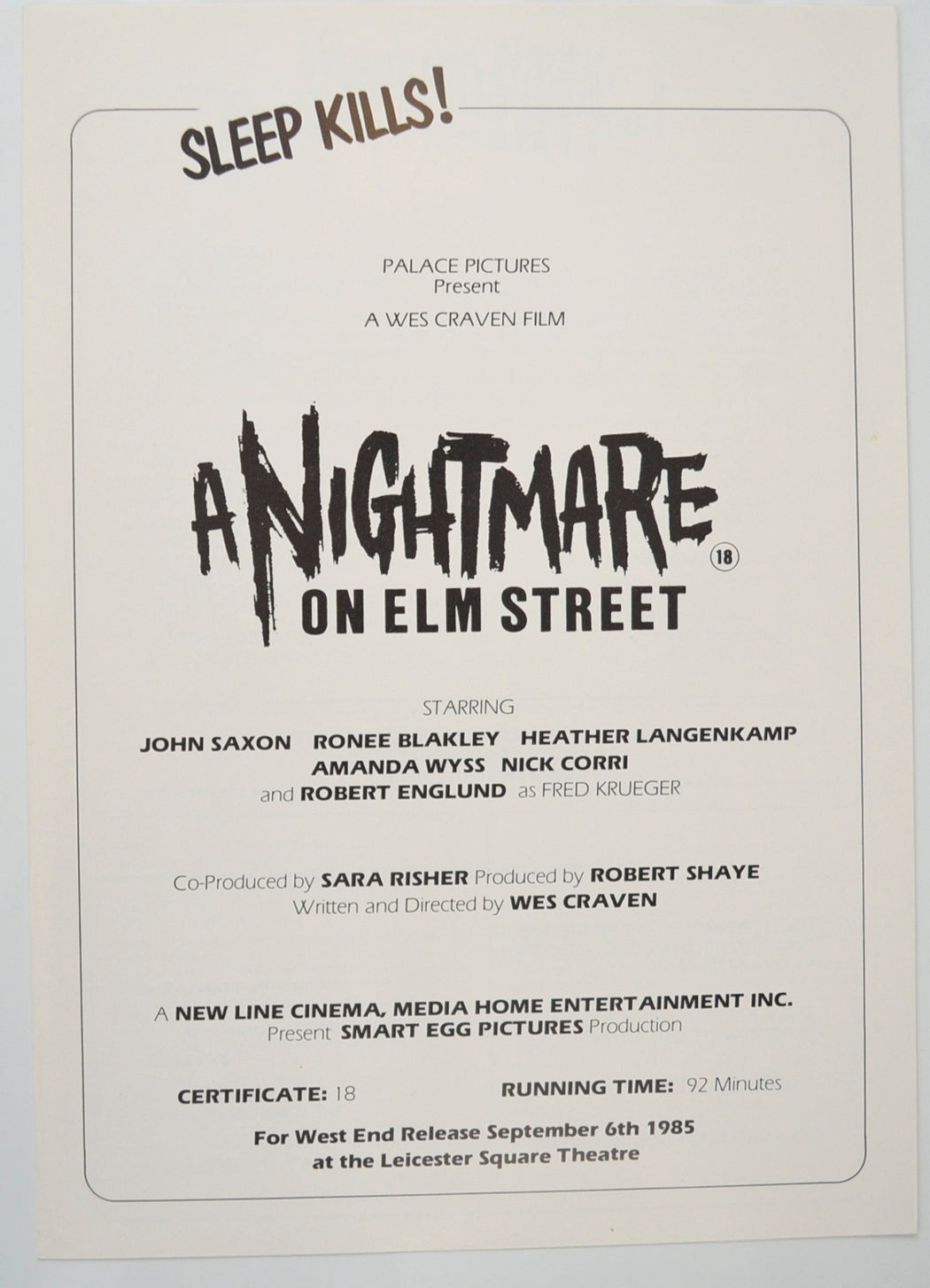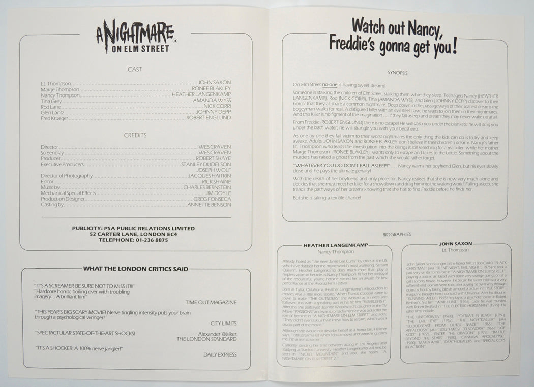 “A Nightmare On Elm Street” Original Cinema Exhibitors Press Synopsis / Credits Booklet (UK)