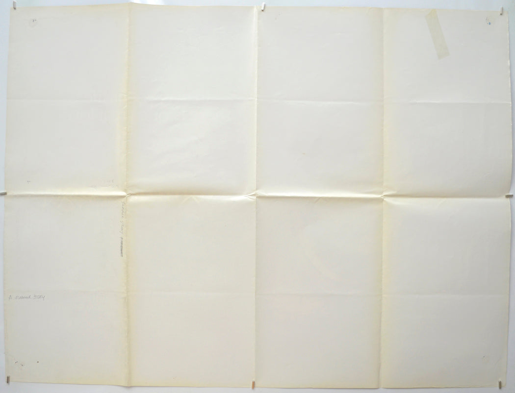 10 cm tear from the top edge downwards (near left corner) this has Sellotape on the back, 2 cm white crease line near the top left corner, tiny tear and a 1 cm white vertical crease line also on the top edge, tiny tear and extremely mild creasing on the bottom edge, three extremely tiny tears and extremely mild creasing/edge wear on the left edge, mild fold wear (a few small white stress marks on some the fold lines) Note there are three horizontal and three vertical folds, some light surface creasing near both side edges including some light vertical creases, blu-tac grease/residue on the back of every corner and the back of the center of every edge plus the title has been written twice on the back in Biro (all only noticeable on the front if the poster is held up to the light / backlit), otherwise good.