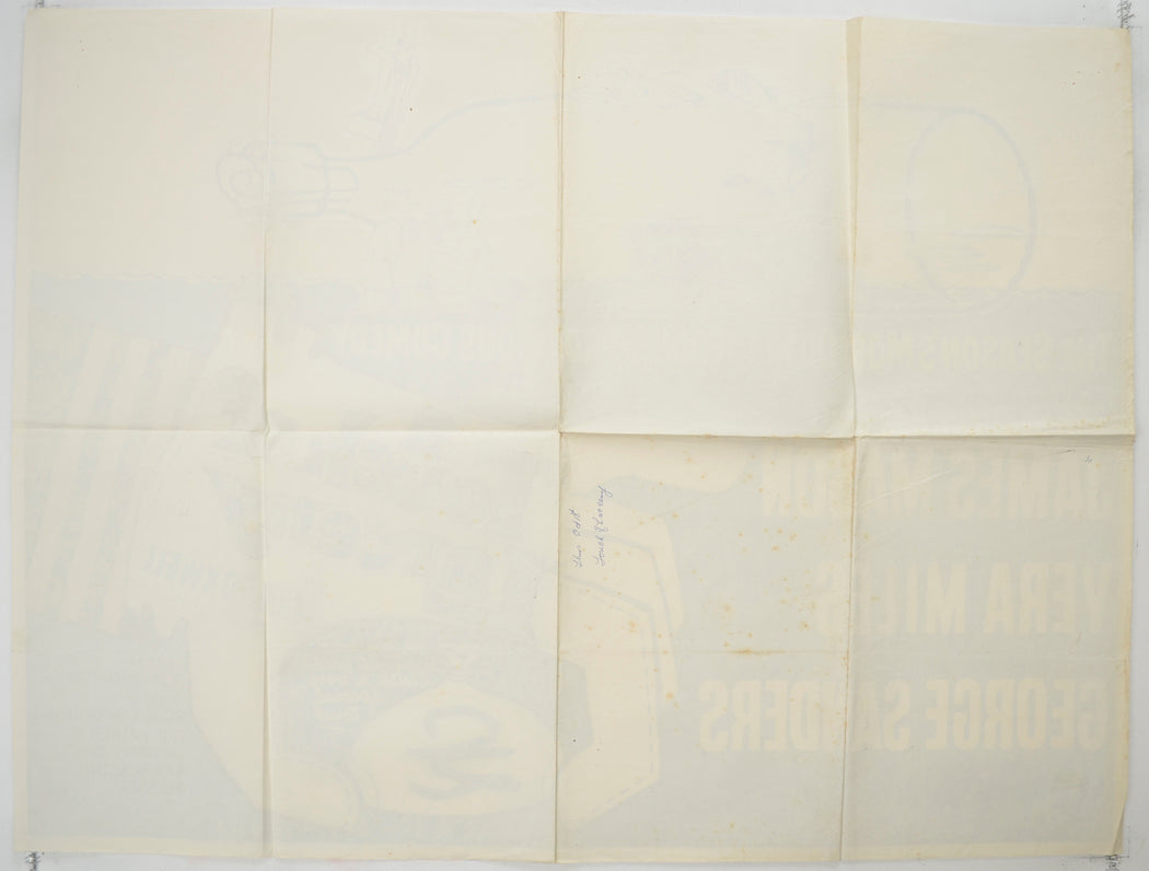 Light creasing to both top corners, 1 cm tear along with three tiny tears and mild creasing on the left edge, two creases across the bottom left corner, extremely mild creasing on the bottom edge, a few tiny Brown speckles of damp in the bottom border and a couple around the top left corner area, duplicate fold lines where it has been folded slightly out of alignment and refolded, extremely mild fold wear (note there are three horizontal fold lines), numerous small Brown patches of damp on the back of the bottom fold segment with the fingers within it (these are lightly visible on the front especially within the white of the fingers… More noticeable if held to light/backlit), two pinholes near both top corners, pinhole a couple of inches down from the top center, pinhole near the bottom center and two more a few inches up, a couple of small dark print marks near both top corners, title written on the back in biro (only noticeable on the front if the poster is held up to the light / backlit), otherwise very good.