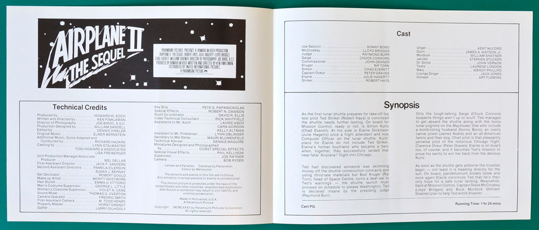 “Airplane 2 : The Sequel” Original Cinema Exhibitors Synopsis / Credits Booklet + 34 Page Production Information Document + Advertising Blocks Sheet