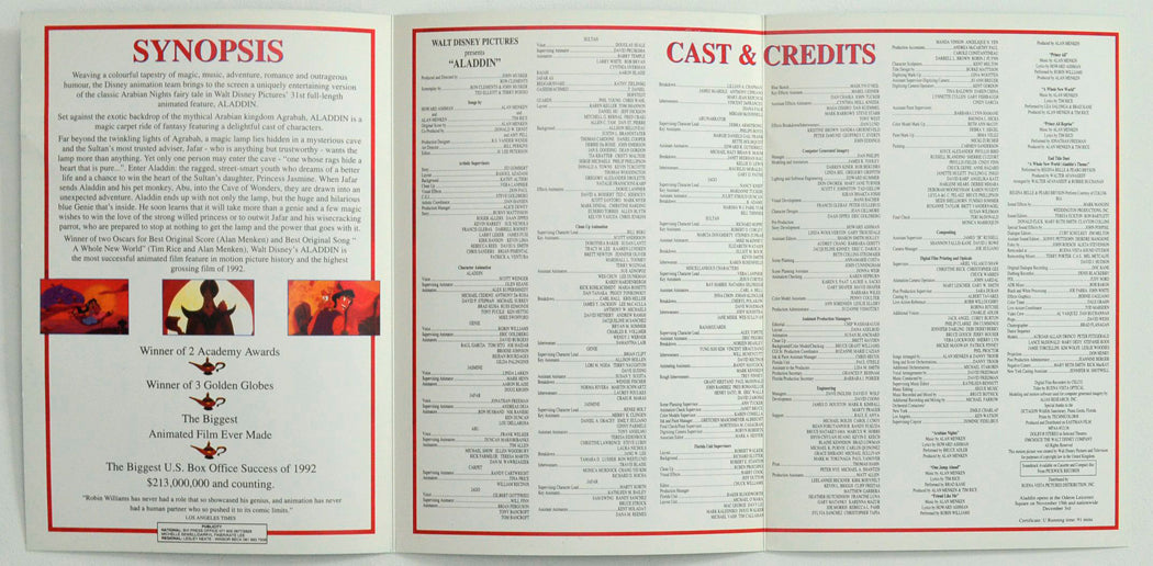 “Aladdin” Original Cinema Exhibitors Synopsis / Credits Booklet