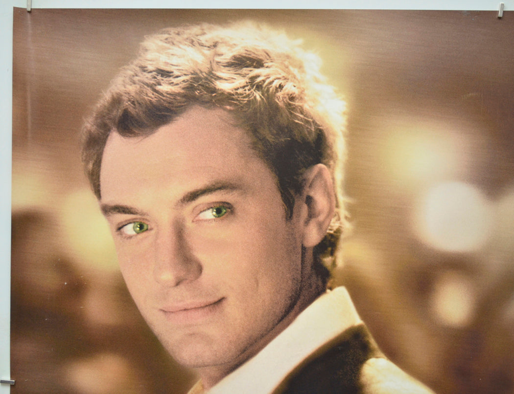 Numerous small white surface creases throughout the first 5 inches (13 cm) of the left of the poster (mostly in the background to the left of Law’s face and chest area), 2 cm jagged white surface crease within the Law’s tie and two tiny creases to the right of his jacket lapel, several small white surface creases within the central area of the poster (diagonally above the J in JUDE), 7 x 3 cm patch of small faint fine vertical light print error lines approximately 9 cm below the top center, a little blu-tac grease/residue near each corner and the center of the top and bottom edges, approximately 6 tiny white surface creases near the right edge (mostly above the E in ALFIE), 1 cm diagonal tear near the top of the right edge, approximately 3 tiny tears and mild creasing on the bottom edge, small patch of fine vertical light brownish print error lines just above the bottom edge (within the left of the jacket area), a couple of tiny white surface creases on the shoulder and neck area, otherwise okay.