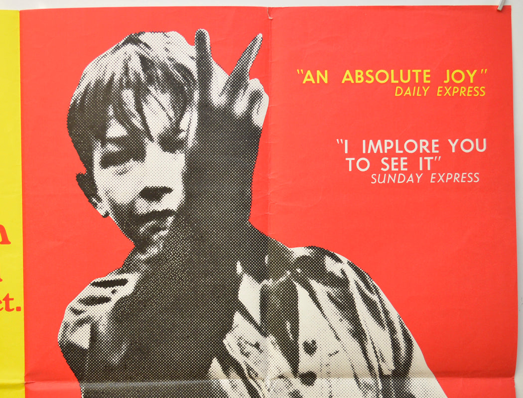 1.5 cm tear at the top of the right vertical fold line, extremely mild creasing on the top edge, 1 cm tear and a small tear on the bottom edge, some very mild creasing along the bottom (some dark print has transferred onto some of the creasing on the left), extremely mild creasing/edge wear on the left edge, small finger mark on the left edge (bottom of the title level), a couple of small dark marks near the top of the left edge, some light surface creasing throughout (more noticeably within the yellow background), extremely mild fold wear (note there are three horizontal and three vertical folds), a lot of writing on the back of the poster in blue Biro (only noticeable on the front if the poster is held up to the light / backlit.. other than two small vertical lines in the red background which are lightly visible on the front just left of the boys ear), otherwise very good.
