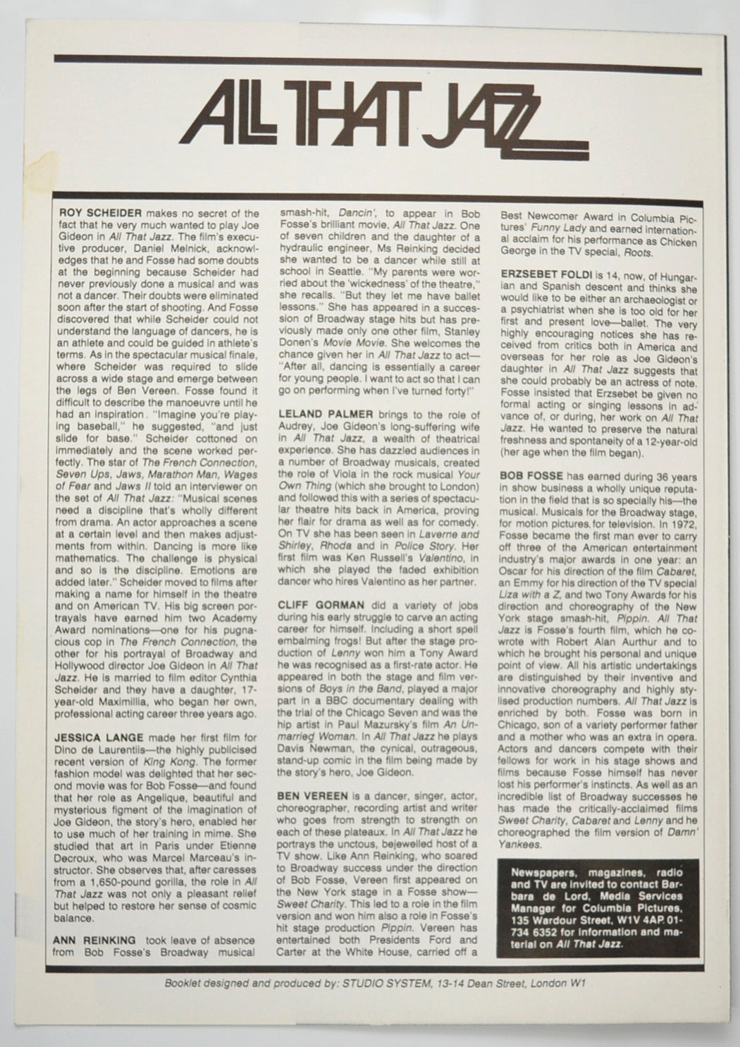 “All That Jazz” Original Cinema Exhibitors Press Synopsis / Credits Booklet (UK)