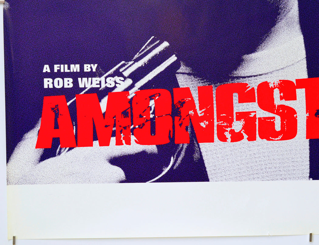 2 cm white crease patch approximately 14 cm inward of the center of the left edge and a slightly smaller patch below the chin of the actor at the center and another within the left lens of the glasses of the actor on the right, three additional slightly smaller creases also evenly spaced across the poster.. one in the top of the right lens of the glasses of the actor on the right and another between the two actors and the third just left of the lips of the actor on the left, tiny tear on the top edge, approximately three tiny tears along with a 1 cm tear and mild creasing on the bottom edge, the 18 certificate is a sticker that has been stuck on by the distributor, a little purple print has transferred into the left of the bottom white border, very slight yellowing to the bottom edge, very faint 8 cm diagonal crease in the neck area above the N in AMONGST, otherwise good.