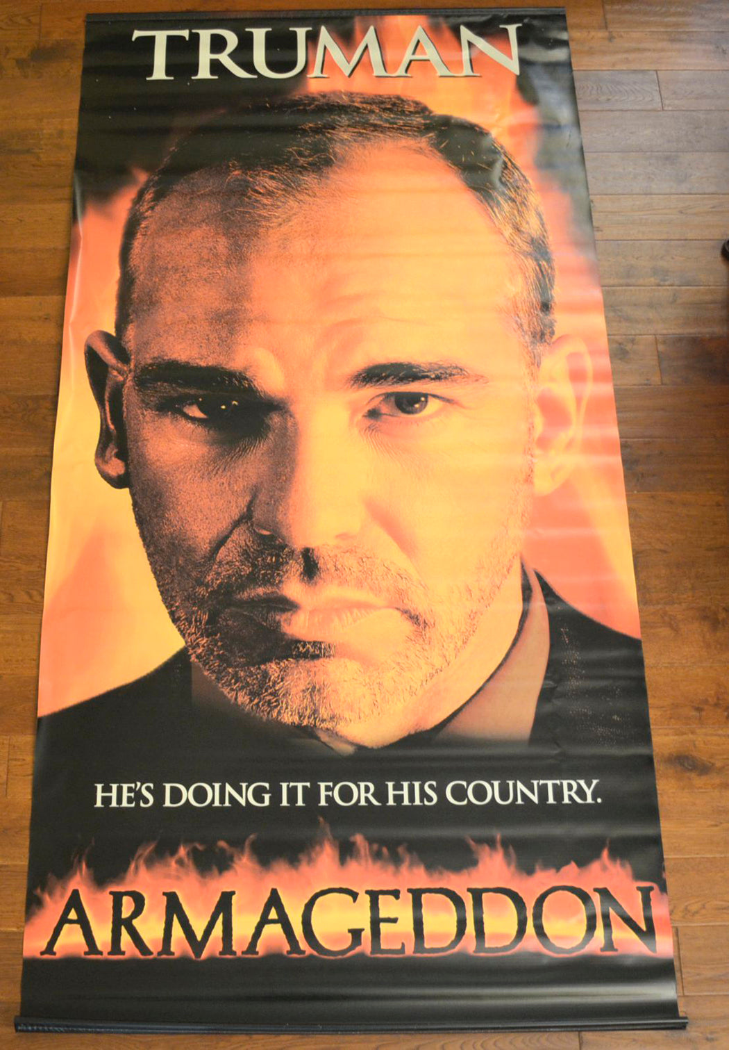 Light horizontal “roll” creases throughout (should dropout if left hanging somewhere warm), vertical band of “pinch” creases from top to bottom (just right of the left ear) again should dropout, line of print loss on the Truman side (in the black area near the top of the right edge), no hanging poles included, otherwise very good.