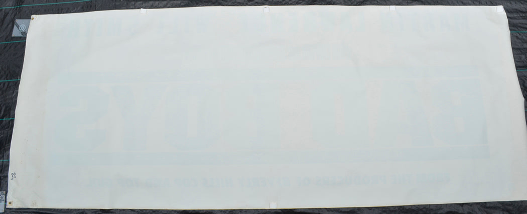 Some very thin slivers have torn away from the left edge (or it was not originally cut properly), a few tiny grubby marks around the bottom left corner, the title has been written on the back in black marker pen which is lightly visible on the front (near the bottom of the right edge), light indentations from a rubber band near the right corners (should dropout), Velro pads on the back of the banner, slight discolouration/grubby marks on the back of the bottom right corner area, otherwise very good.