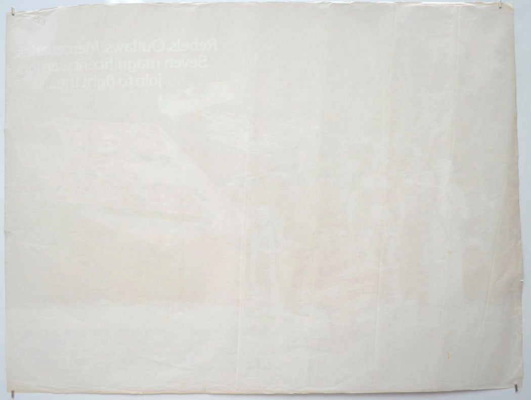Approximately 10 vertical (ish) creases from top to bottom evenly spaced across the poster, two extremely tiny tears and moderate creasing along the top, 15 cm crease and a smaller crease across the top right corner, 11 cm diagonal crease and some additional creasing across the bottom right corner, mild creasing on the right edge, 1 cm tear and three smaller tears on the bottom edge along with moderate/heavy creasing, 14 cm diagonal crease across the bottom left corner, 1 cm tear and a smaller tear on the left edge along with mild creasing, tiny yellowish stain spot on the back of the bottom left area (only noticeable on the front if the poster is held up to the light / backlit), otherwise good.