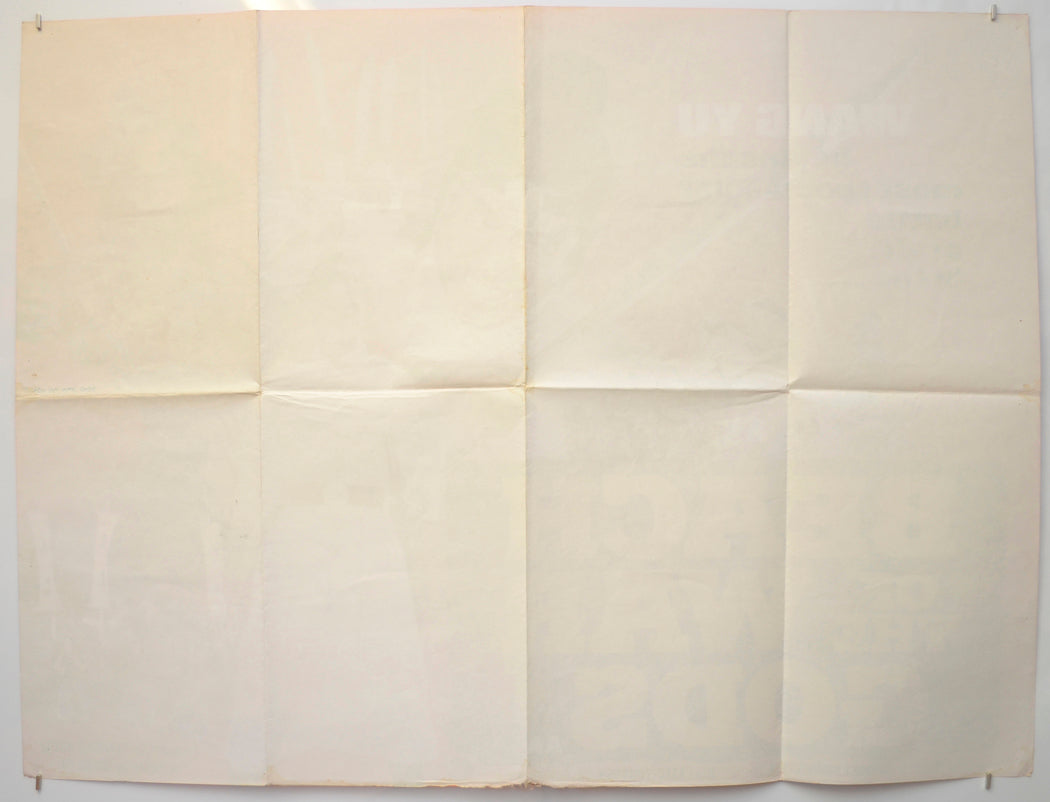 9 cm thin strip of frayed paper loss at the bottom center and a tiny spot of paper loss on the tips of the bottom corners (the paper loss on the bottom is due to slight water damage to the tip of the bottom edge…this has also caused a very faint water stain across both bottom corners and in places along the tip of the bottom edge), a couple of additional tiny spots of paper loss on the bottom edge, tiny amount of fraying with a tiny amount of paper loss on the tip of the top edge (left), pinhole near each corner and the center of each edge, three additional pinholes near the left edge, light surface creasing between the center and right fold intersections (just below the center horizontal fold line), very faint water stain on the back of the center of the left and right edges and also a little on the back of the tip of the top edge (all only noticeable on the front if the poster is held up to the light / backlit), the title has been written on the back in green Biro (again only noticeable on the front if backlit), otherwise very good, in my opinion would look excellent if framed to hide the limited paper loss at the bottom center.