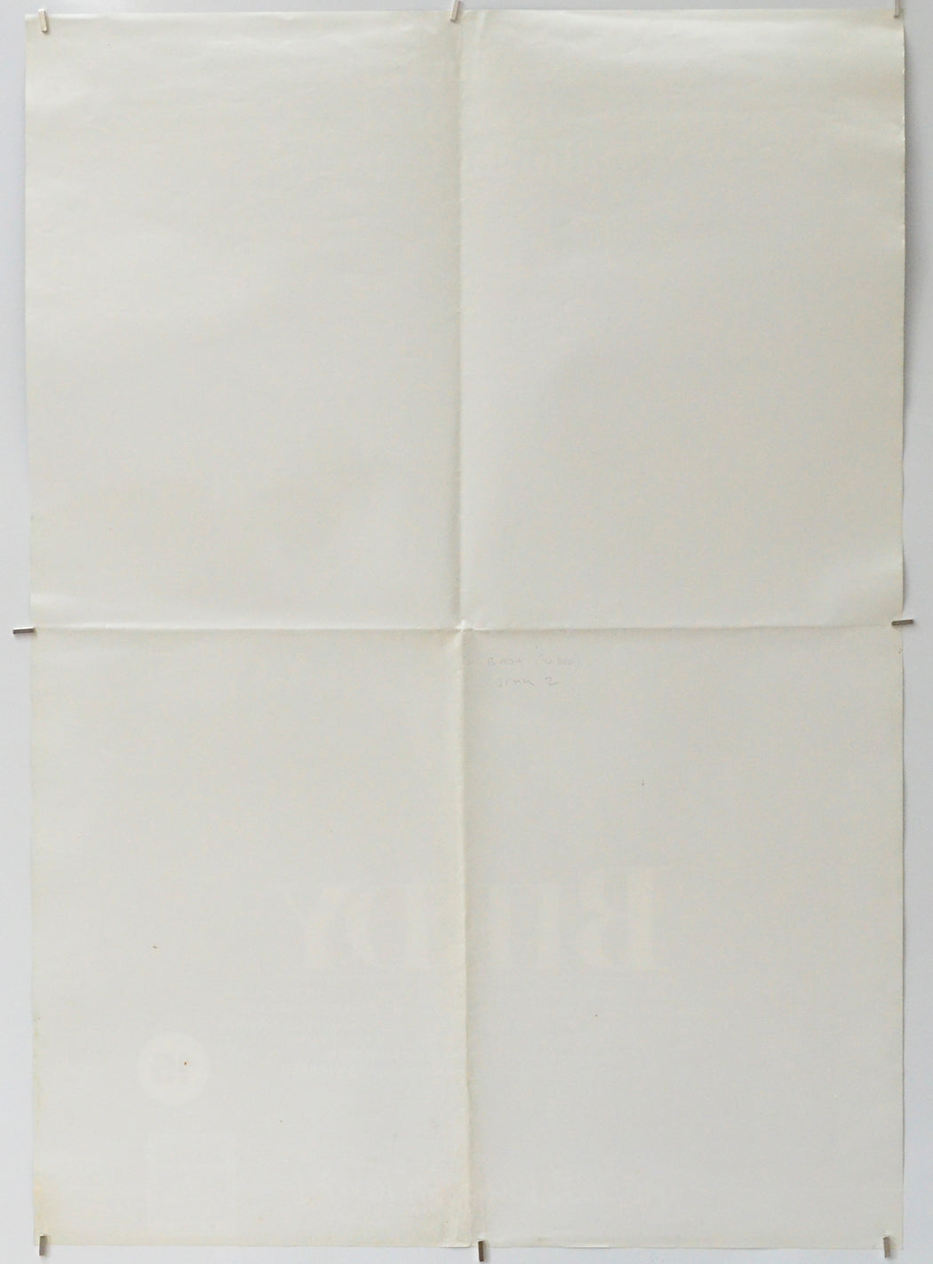 Moderate/heavy creasing and a couple of tiny tears around the center of the bottom edge, tiny tear and a few additional tiny creases on the remainder of the bottom edge, four tiny tears and very mild creasing/edge wear on the top half of the left edge, mild creasing around the top center, 1 cm horizontal crease across the top right corner, small white surface crease near the top right corner, mild fold wear (white stress marks on the fold lines), tiny indentation dot below the window and another above the Y in BIRDY, some light surface wrinkles throughout, slight Browning/Brown spots of damp (foxing) on the back of the bottom half of the right edge and the back of the bottom half of the center vertical fold line along with a few tiny darker spots on the back of the bottom right corner area (only noticeable on the front if the poster is held up to the light / backlit), otherwise good.Double Sided :