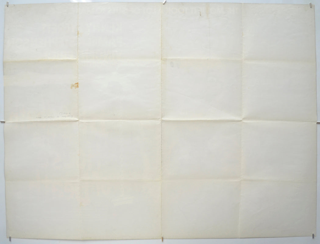 2 cm diagonal crease across the top left corner, 1 cm tear along with a couple of tiny tears and extremely mild edge wear on the top edge, 3 cm diagonal crease and a smaller crease across the top right corner, extremely mild creasing on the bottom edge, 2 cm diagonal crease across the bottom left corner, extremely mild edge wear on the left edge, approximately 4 pinholes and a couple of small patches of blu-tac type grease (pink blu-tac) near both top corners, eight pinholes near the bottom right corner and two near the bottom left corner, pinhole several centimetres downward from the center of the top edge, light fingermarks around the corners and below the center of the top edge, mild fold wear (light stress marks on some the fold lines and additional creasing around some of the intersections) note there are three horizontal and three vertical folds), a few small white surface creases near the bottom, small blu-tac grease mark near the bottom (just right of the bottom of the left vertical fold line), 3 x 2 cm Brown liquid stain on the back of the poster (a small spot of this is lightly visible on the front just within the bottom edge of the white arm (right of the wrist) the rest is only noticeable if held to light/backlit, a couple of faint liquid splashes on the back of the top edge and two additional tiny light Brown liquid stains on the back of the left vertical fold line (all only noticeable on the front if the poster is held up to the light / backlit), otherwise very good. Quite vibrant artwork!