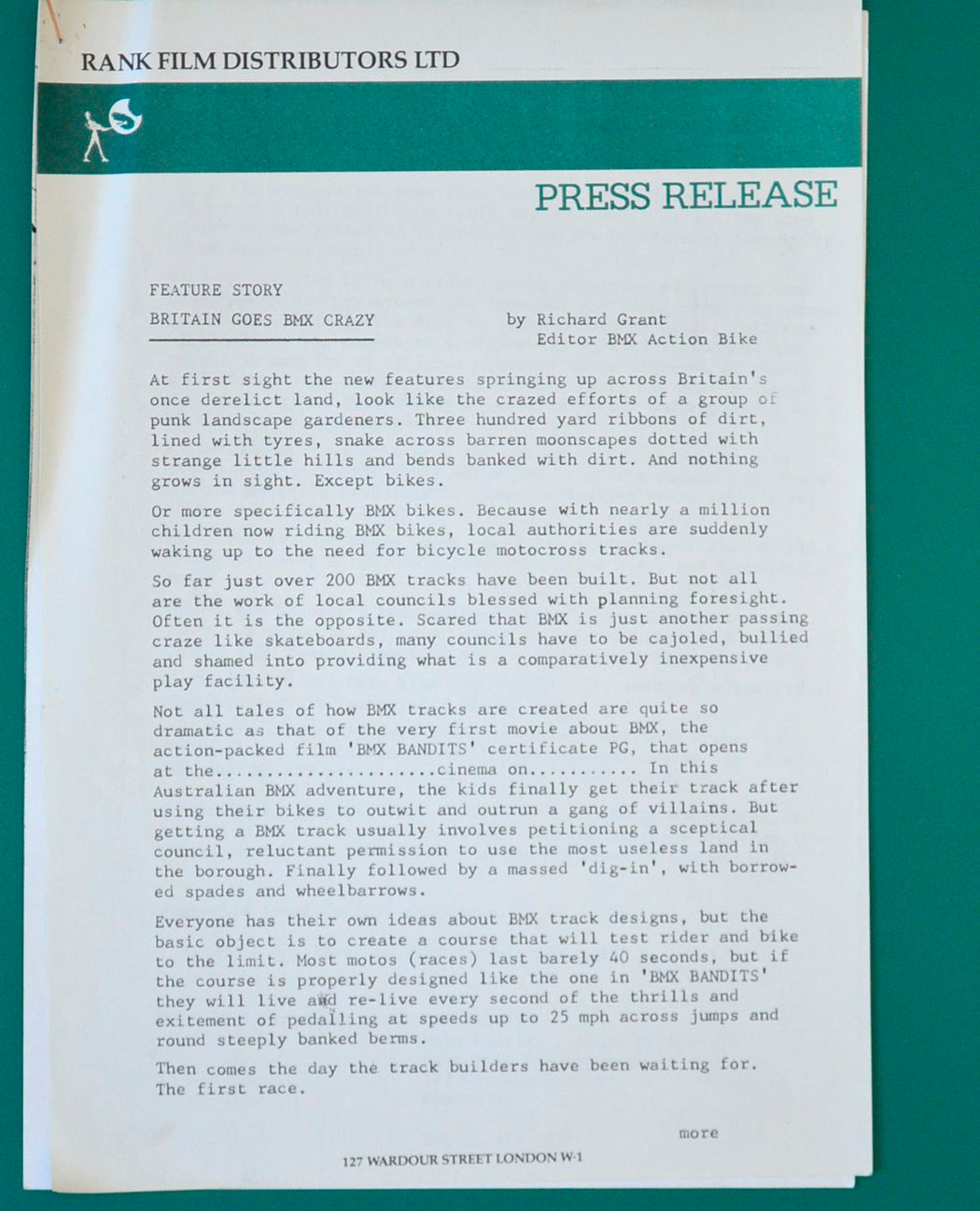 “BMX Bandits” Original 4 Page Cinema Exhibitors Synopsis / Credits Booklet + 2 Page Press Release Document