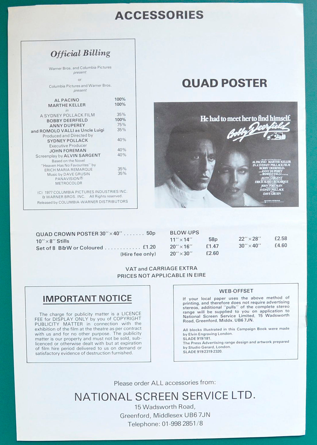 “Bobby Deerfield” Original 8 Page Cinema Exhibitors Campaign Press Book