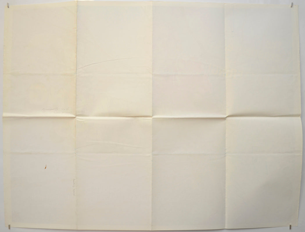 9 cm tear along the right edge of the bottom horizontal fold line (this has acid free tape on the back reinforcing it), three tiny tears and mild creasing also on the right edge, extremely tiny piece torn from the tip of the bottom right corner, a couple of tiny tears and mild creasing/edge wear on the left edge, tiny tear through the top left corner, a couple of small dark print marks near the top right corner, extremely mild fold wear including some light stress marks on the fold lines and very mild creasing around some the fold intersections (note there are three horizontal and three vertical folds), crease between the center and right vertical fold lines (from microphone across to the man’s neck), otherwise very good.