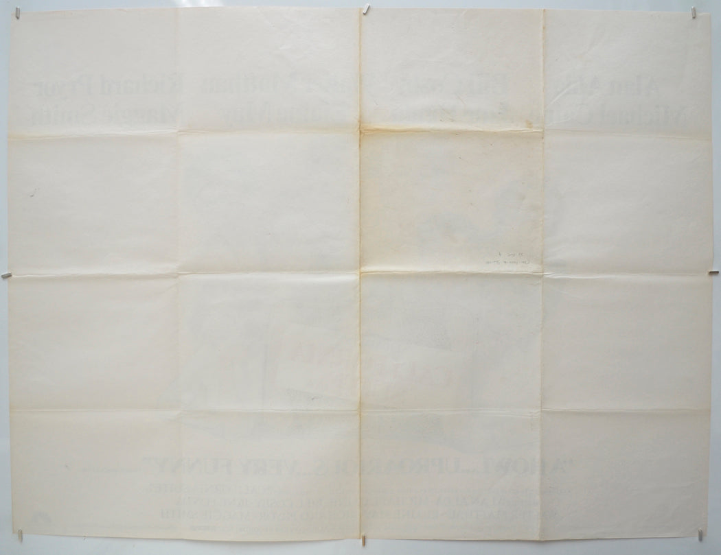 Small crease on the right of the top edge (a little dark print has transferred onto it), two pinholes near both top corners, pinhole either side of the center of the top edge, Browning to the back of the center and left vertical fold lines and the back of the top and center horizontal folds (slightly visible on the front… More so if the poster is held to light/backlit), small light Brown liquid stain on the back of the poster (lightly visible on the front just below the E in the CAINE credit near the top left corner), light creasing around some the fold intersections (note there are three horizontal and three vertical folds), small area of dark patchy print in the pink background to the left of Alda’s arm, otherwise very good!