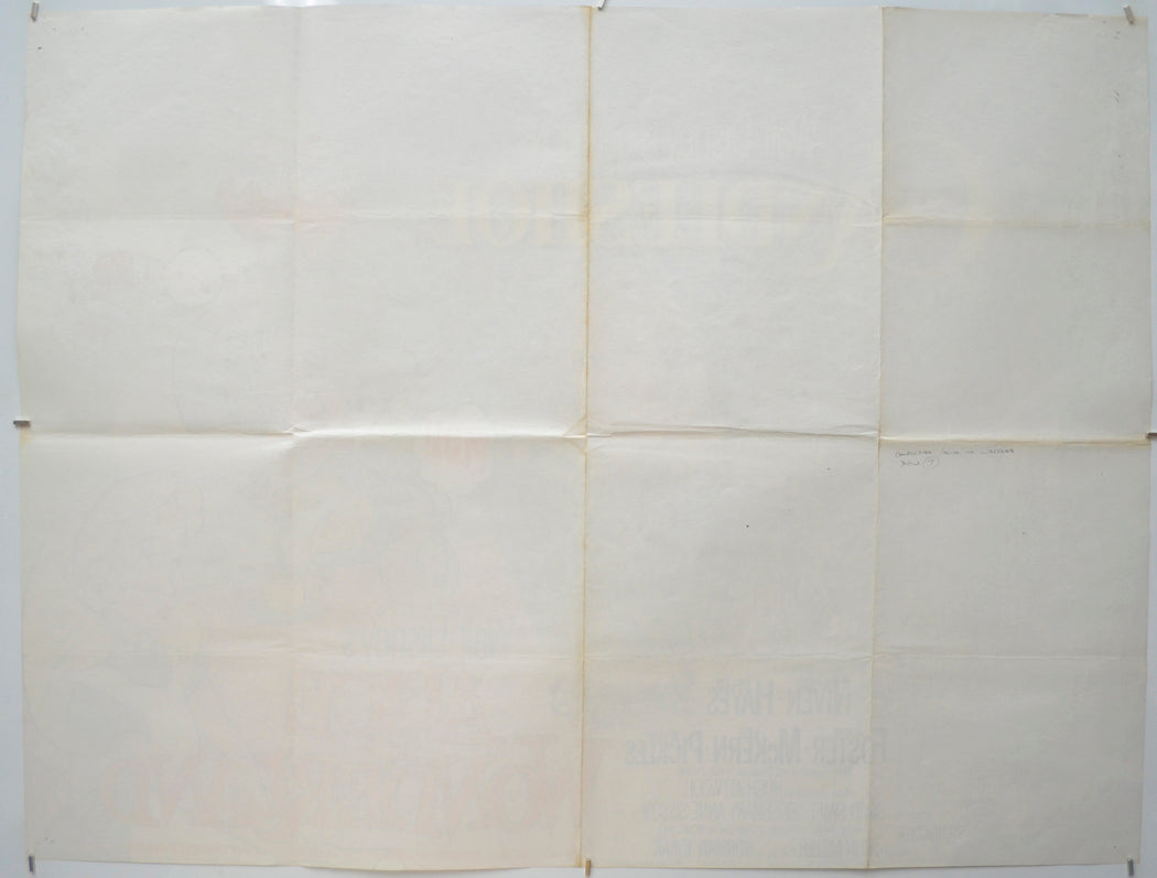 2 to 5 pinholes near every corner (some have torn slightly), pinhole either side of the top center (both are a few centimetres inward of the edge and the top center), two pinholes just above the house, very light creasing around some of the fold intersections (note there are three horizontal and three vertical folds), Browning to the back of the center and left vertical fold lines and a little on the back of the left quarter of the top and center horizontal folds (a little of this is visible on the front at the bottom of the center vertical fold…the rest is only noticeable if the poster is held to light/backlit), otherwise very good!!