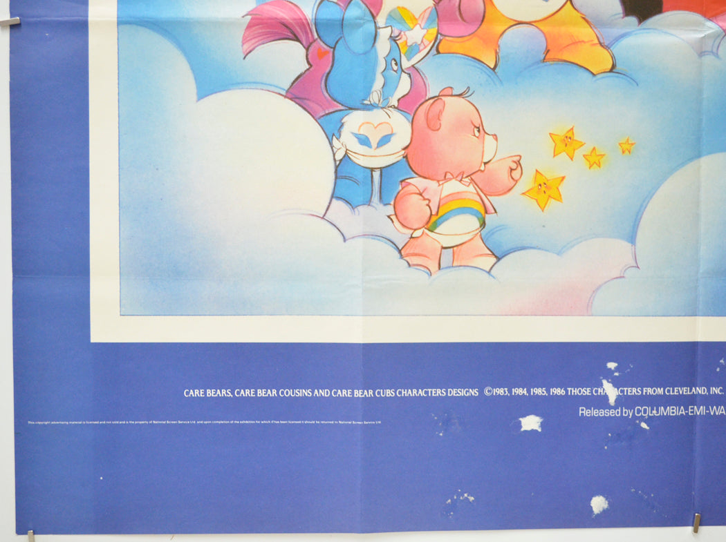 Numerous patches of print loss around the bottom central area (all below the bottom white border of the main image but some do go through the two lines of text at the bottom), additional patchy print loss just left of the bottom line of the credits block, small patch of blu-tac residue just below the center of the right edge, 1 to 4 pinholes near every corner and the center of every edge (some of the pinholes are several centimetres inward of the edges), pinhole just right of the feet of the pink care bear at the bottom, pinhole in the dark blue background to the right of the bottom of the white border of the main image, light creasing around some the fold intersections (note there are three horizontal and three vertical folds), Browning to the back of the right quarter of the top edge (only noticeable on the front if the poster is held up to the light / backlit), small indentation Mark through the bottom of the II in the title, otherwise good (and in my opinion as the print loss is mostly within the plain blue background areas, it could be artistically covered)