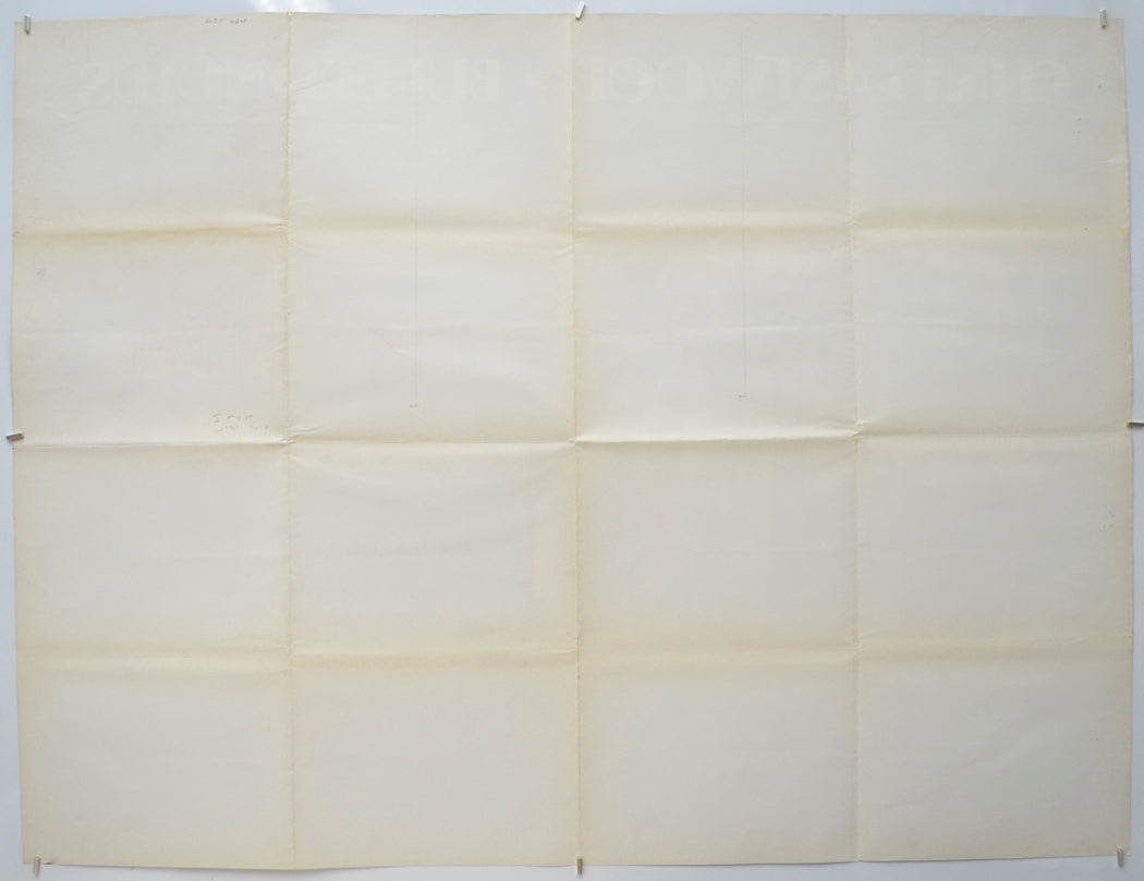 1 cm tear and very mild edge wear at the top of the right vertical fold line, two small tears and very mild creasing on the right edge, 2 cm diagonal crease and a couple of tiny creases across the bottom right corner, tiny tear and extremely mild creasing on the bottom edge, two tiny creases across the bottom left corner, 8 cm diagonal crease at the bottom of the left edge, two tiny tears and mild creasing/edge wear on the left edge (particularly around the edges of the fold lines), mild fold wear (stress marks on the fold lines and additional creasing around the fold intersections) note there are three horizontal and three vertical folds, three additional extremely faint fold lines/creases across the poster (evenly spaced between the main folds and the edges) These also a few light stress marks on them here and there, a few small white surface creases near the side edges, approximately 16 pinholes near the left edge, yellowing to the back of the fold lines and edges and the title has been written on the back of the top edge in blue Biro (all only noticeable on the front if the poster is held up to the light / backlit), otherwise good.