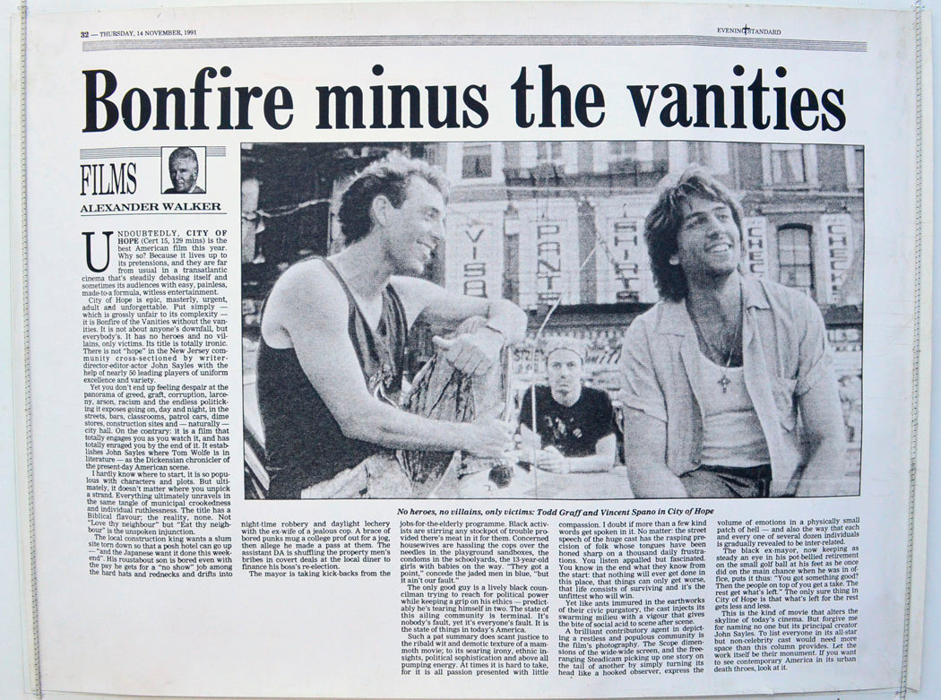 Poster version of Alexander Walker’s film review from the Evening Standard on 14 November 1991, poster is very grubby around the edges with a mix of fingerprints and dark print marks throughout, four 1 cm edge tears and a couple of smaller tears along with mild creasing on the bottom edge, small tear on the left edge, two tiny tears on the top edge, pinhole near each corner, several surface creases near both side edges (again some dark print has transferred onto some of these), band of reddish print just above the “bonfire minus” text, a few small spots of blu-tac residue near each corner and a few additional spots along the top, four vertical crease lines evenly spaced across the poster (from the top edge down to just past the center), otherwise good, nice thick paper stock.