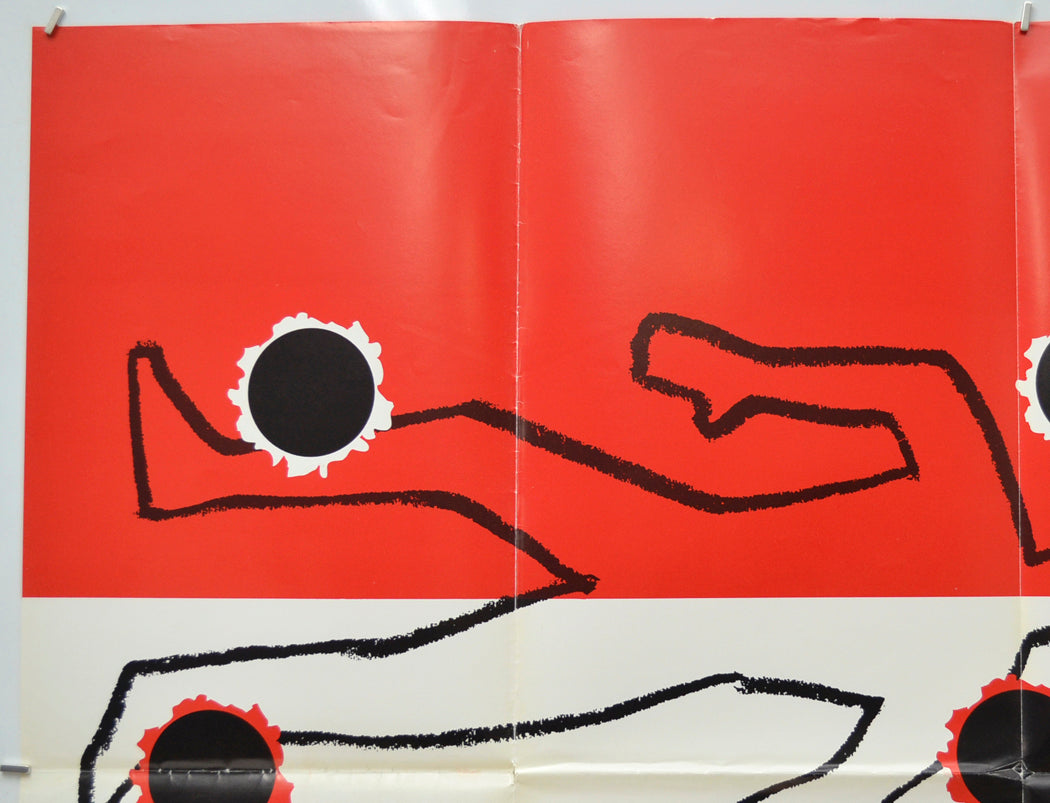 The poster has yellowed slightly with age (a little darker around the edges and fold lines), extremely mild creasing on the right edge, a little reddish print has transferred onto the right edge, some very faint patches of damp around the edges and on the back of the bottom left corner fold segment (the patches on the back are a little darker), mild fold wear including a 1 cm tear at the left fold intersection, title written on the back in biro (only noticeable on the front if the poster is held up to the light / backlit), a little of the print from a couple of letter from the credits block has transferred into the white background above the O in the title, otherwise good.