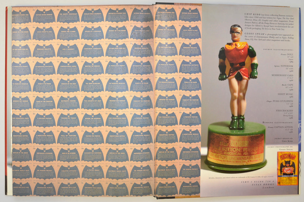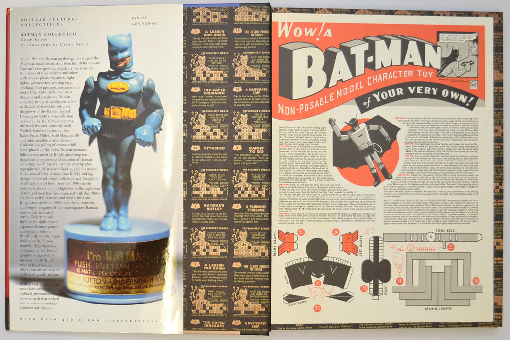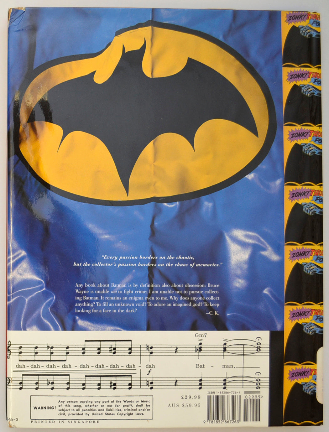 Hardcover Book featuring Photographs of the rarest Batman memorabilia with accompanying text. Including photographs of figurines and toys, games, clockwork robots, novels, cards and models.