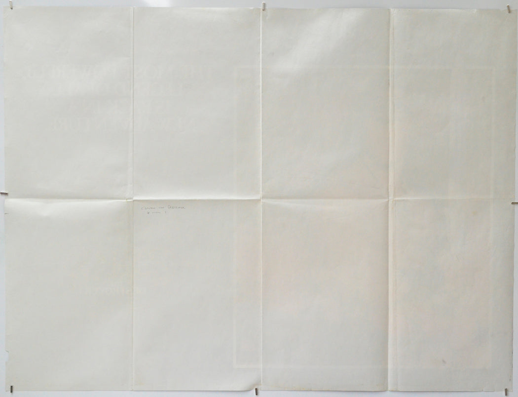 3 x 1 cm piece torn from near the bottom of the right edge with surrounding creasing, two 1 cm tears along with two smaller tears and mild creasing also on the right edge, 4 cm light diagonal crease and a smaller crease across the top right corner, 6 cm diagonal crease across the bottom left corner along with some additional light creasing, 64 cm slightly diagonal crease from near the bottom of the right edge across to just left of the center of the bottom edge, 1 cm tear along with three smaller tears and mild/moderate creasing on the bottom edge, tiny spot of edge wear at the bottom of the left edge, 2 cm tear along with two small tears and mild creasing on the top edge, tiny pinhole near both bottom corners, light surface wrinkling throughout (mostly near the side edges), a few tiny white unprinted specks of in the black background just below the center of the left edge, two additional vertical fold lines just left of the main left vertical fold line and one additional vertical fold line just right of the main right fold (due to been folded out of alignment and refolded), mild fold wear including creasing around and between some of the fold intersections and also some creasing above the center horizontal fold line along with a few white stress marks, some faint finger grease marks near each corner and the top center (only really noticeable at certain viewing angles), otherwise good.Double Sided :