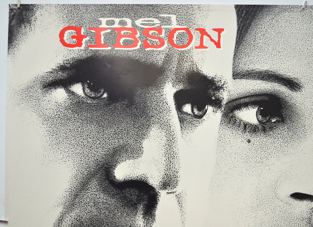 Small tear through the tip of the top left corner (the corner tip is hanging by a thread), additional creasing also around the top left corner, tiny tear and mild creasing on the top edge, 2 cm thin diagonal crease/scuff patch across the top right corner, 1 cm tear on the right edge, 2 cm tear and mild creasing on the bottom edge, tiny crease across the bottom left corner, tiny tear and very mild creasing on the left edge, a few light surface wrinkles throughout including one below Gibson’s nose and some within the black background on the right, very light horizontal indentation line completely across the top of the poster (just below the top edge) probably caused by a cinema frame, otherwise good.