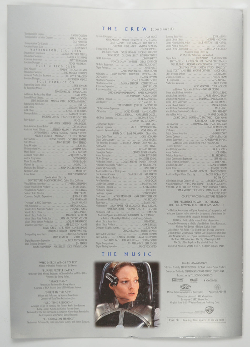 Jodie Foster, Matthew McConaughey, James Woods, Jena Malone, David Morse, Geoffrey Blake, William Fichtner, Sami Chester, Timothy McNeil, Laura Elena Surillo, Tom Skerritt, Henry Strozier, Michael Chaban, Maximilian Martini, Larry King, Thomas Garner, Conroy Chino, Dan Gifford, Vance Valencia, Angela Bassett, Donna J. Kelley, Leon Harris, Claire Shipman, Behrooz Afrakhan, Saemi Nakamura, Maria Celeste Arraras, Tabitha Soren, Geraldo Rivera, Ian Whitcomb, Jay Leno, Natalie Allen, Robert D. Novak, Geraldine A. Ferraro, Ann Druyan, Rob Lowe, Jake Busey, Kathleen Kennedy, Michael Albala, Ned Netterville, Leo Lee, John Hurt, William Jordan, David St. James, Jill Dougherty, Haynes Brooke, John Holliman, Bobbie Battista, Dee Dee Myers, Bryant Gumbel, Linden Soles, Steven Ford, Alex Zemeckis, Janie Peterson, Phillip Bergeron, Jennifer Balgobin, Anthony Fife Hamilton, Rebecca T. Beucler, Marc Macaulay, Pamela Wilsey, Tucker Smallwood, Jeff Johnson, Yuji Okumoto, Gerry Griffin, Brian Alston, Rob Elk, Mark Thomason, José Rey, Todd Patrick Breaugh, Alex Veadov, Alice Kushida, Robin Gammell, Richardson Morse, Seiji Okamura, Bernard Shaw, Mak Takano, Tom Tanaka, Catherine Dao, Kristoffer Ryan Winters, Valorie Armstrong, Jim Hild, Bill Thomas, Diego Montoya, Candice Cook, Sunshine Logroño, Paul L. Nolan.