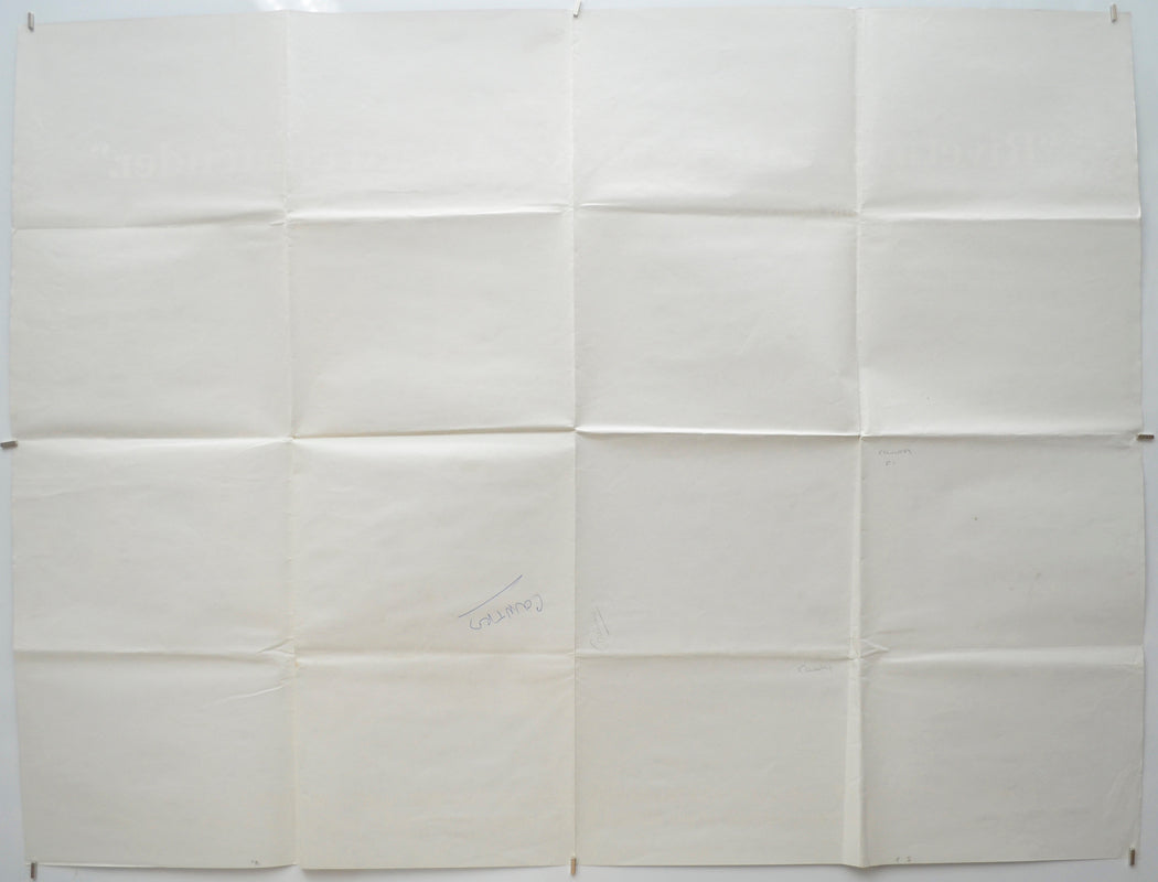 Small crease across the tip of the top corners, extremely mild edge wear at the edges of some of the fold lines, light surface creasing near the left edge, additional creasing around the left and right vertical fold lines due to being folded slightly out of alignment and refolded, very mild fold wear (stress marks on some of the fold lines and additional creasing around some intersections) note there are three horizontal and three vertical folds, the title has been written on back in blue Biro (only noticeable on the front if the poster is held up to the light / backlit), otherwise very good.