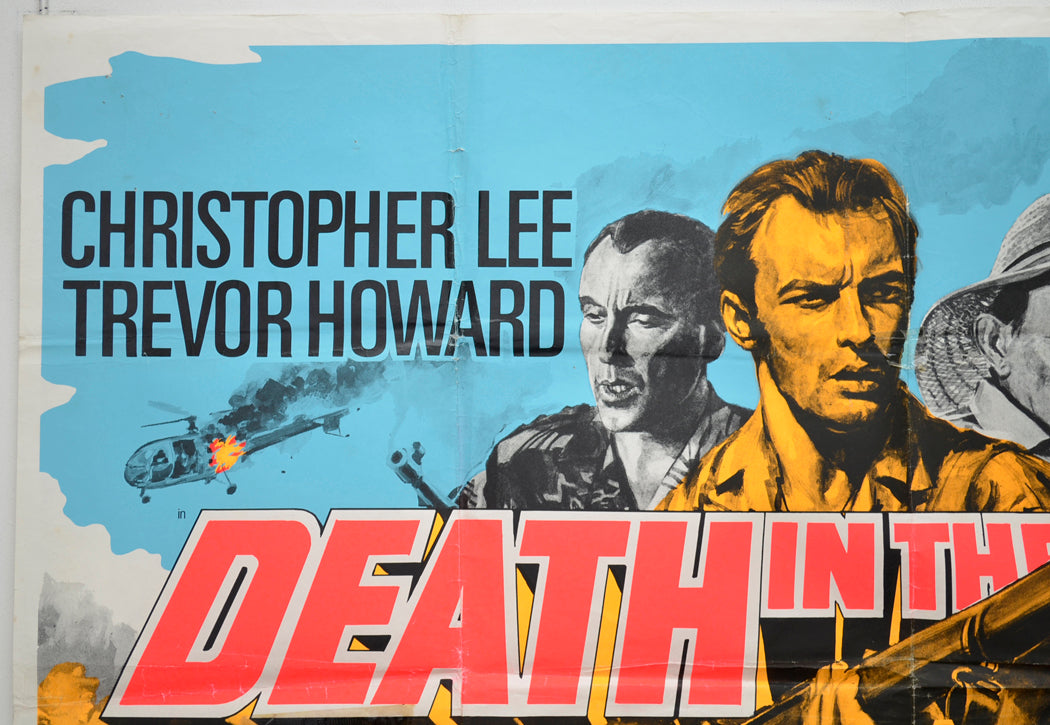 Eight pinholes around the top left corner section and five pinholes around the top right corner section (mostly are several inches inward of the edges), pinhole a couple of inches below the top center, three pinholes above the helicopter on the right, pinhole just left of Christopher Lee’s cheek, pinhole just right of Trevor Howard’s hat, 2 to 3 pinholes near both bottom corners and the bottom center, pinhole in the machine gun of the man bottom left, pinhole near the bottom of the right vertical fold, pinhole just above the left of the burning building,
