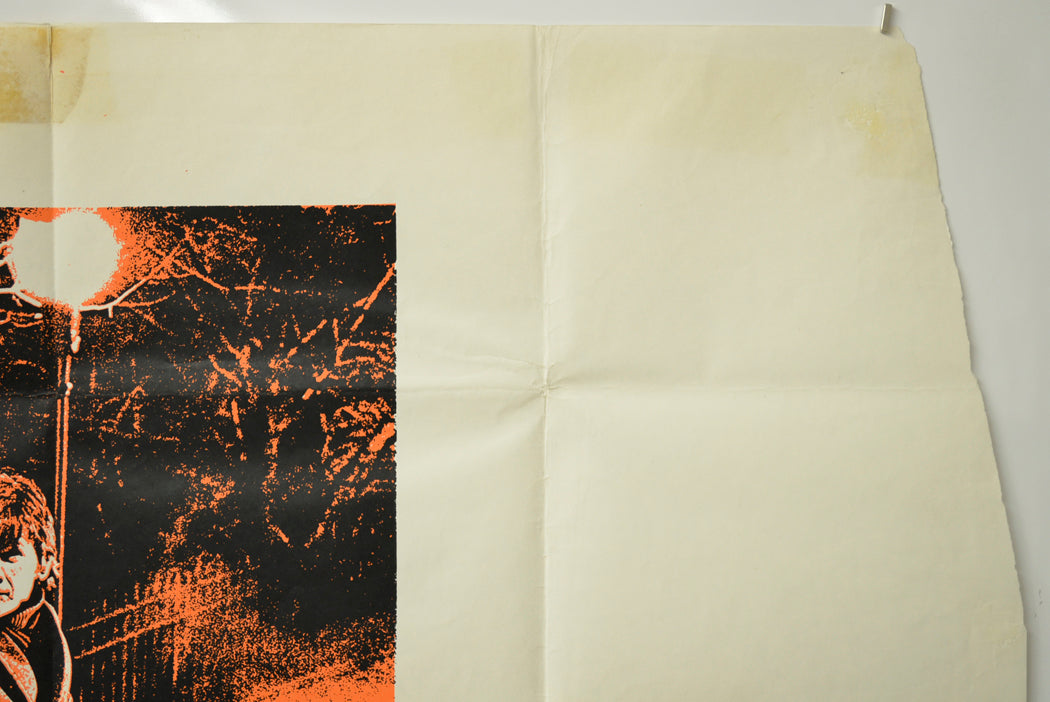 BAD! - 32 x 7 cm triangular piece torn from the top right corner, 7 x 4 cm piece torn from the bottom edge with surrounding 17 x 5 cm tape adhesive stain, 6 cm tear near the top left corner (this has been taped up from the back and there is a by 5 cm tape adhesive stain surrounding the tear plus there is a little patchy surface paper loss in this area also), 3 cm tear at the center of the top edge which has also been taped up from the back and there is a 5 x 5 cm tape adhesive staining through the front along with a little surface paper loss in this area also, a couple of small patches of surface paper loss and a faint tape adhesive stain around the top right corner area, there are additional faint discolouration blocks along the top and bottom edges due to the previously mentioned paper adhesive stains seeping through the paper whilst stored folded for many years, two small tears and mild creasing on the bottom of the right edge, small Brown stain on the bottom right corner, blu-tac residue on the bottom left corner, small patch of shiny residue? on the bottom left corner and another patch near the top corners and top center, small grey mark just inward of the center of the left edge, poster has yellowed with age slightly, some black print from the text in the top left corner has smudged into the white background surrounding it, mild fold wear (creasing around the fold intersections), light surface creasing in the white background on the left, the main image is very good.