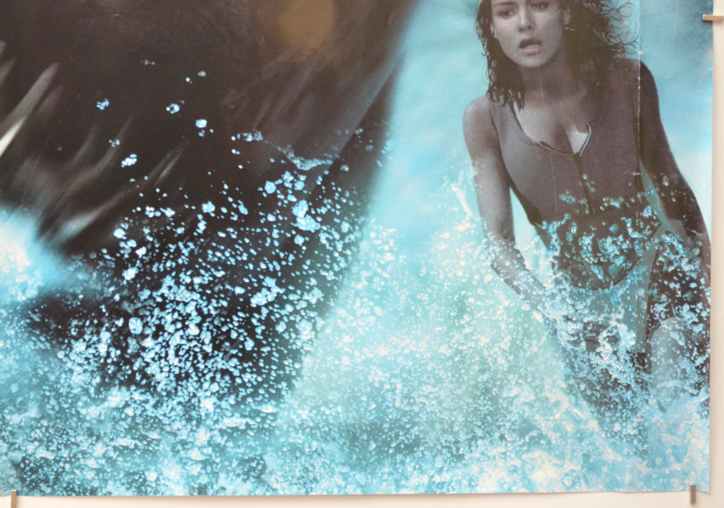 Vertical crease from top to bottom near the right edge (has some white stress marks on it), horizontal crease/fold line completely across the poster (a couple of inches up from the bottom), 20 cm vertical fine light print error line going down through the woman’s face and body and another to the right of her head, 20 cm horizontal fine print error line and a smaller line within the top dark area of the shark (just below the top edge), a few tiny white surface creases within the center of the mouth of the shark and a 4 cm diagonal crease within the left corner of the mouth, 2 cm tear on the top edge, tiny tear near the bottom of the right edge, approximately 3 tiny tears and mild creasing on the bottom edge, approximately 6 to 8 tiny pinholes near every corner and near the center of every edge, a few random small white surface creases here and there, otherwise good.