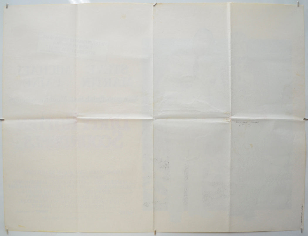 A few tiny faint Brown specks of damp (foxing) on the back of the top edge and on the back of the top center along with some on the back of the top half of the right edge area (some of these are very lightly visible on the front… The rest are only really noticeable if the poster is held to light/backlit), slightly darker patch of Browning on the back of the center fold intersection of the left vertical fold line and there is a 1 cm patch diagonally below it (only noticeable on the front if the poster is held up to the light / backlit), 2 cm thin light Brown liquid streak and a couple of tiny dark splashes on the back of the bottom right corner area (this is lightly visible on the front… More so if the poster is held to light/backlit), the title has been written on the back of the left edge in black pen (this is very faintly visible on the front… More noticeable if the poster is held to light/backlit), light creasing around some of the fold intersections (note there are three horizontal and three vertical folds), otherwise very good.