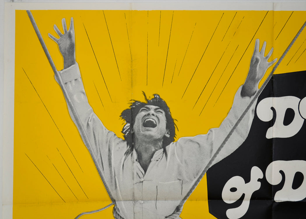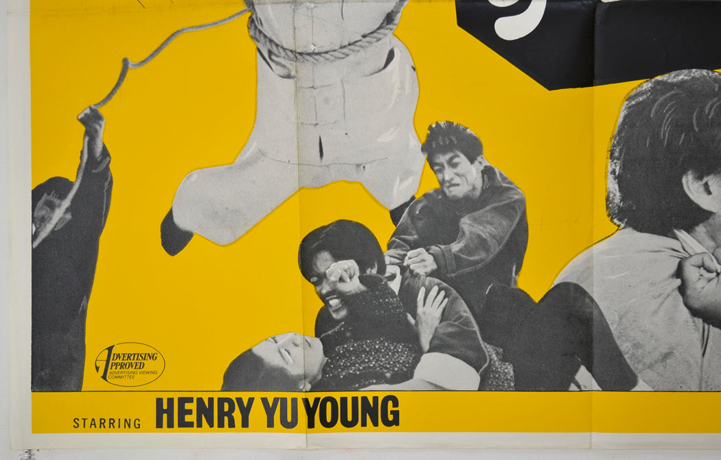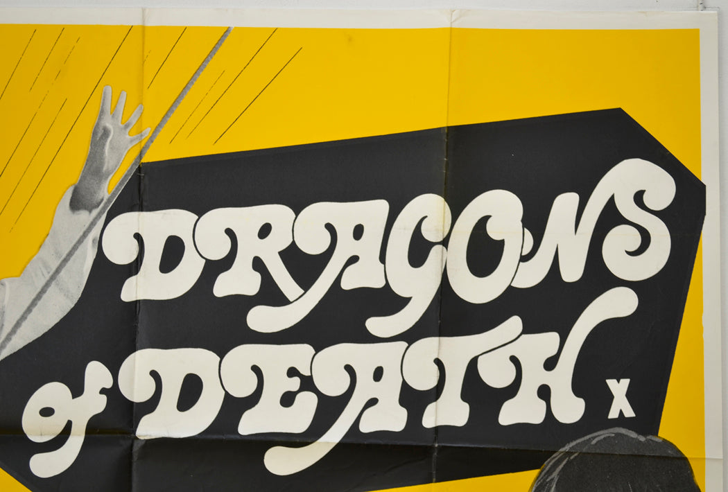 1 cm tear and a tiny tear on the top edge along with very mild creasing, very mild edge wear on the bottom edge, extremely tiny tear and very mild edge wear on the right edge, mild fold wear including a 2 cm tear across the top fold intersection of the center vertical fold line and a tiny tear also on the center vertical fold line along with approximately 6 extremely tiny tears on the left vertical fold line… Note there are three horizontal fold lines), a little dark print has transferred onto and around some of the fold lines (particularly above the head of the man on the rope), small dark finger mark in the yellow background near the top edge (a few inches above the “a” in “Dragon”), title written on the back in biro (only noticeable on the front if the poster is held up to the light / backlit), Otherwise Very Good!