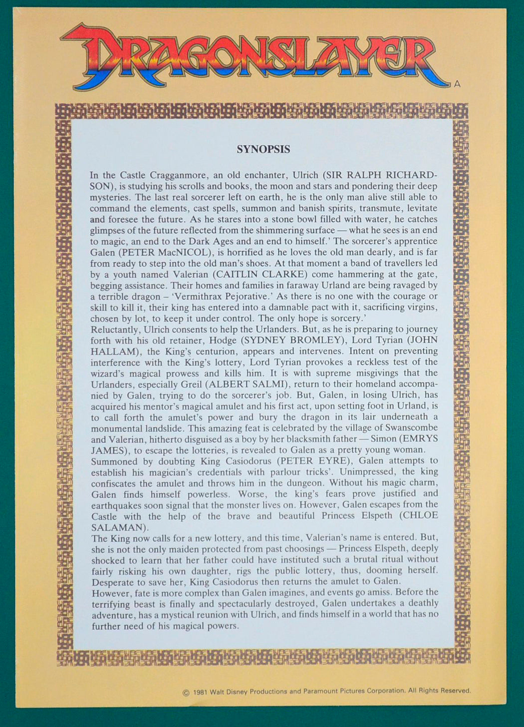 “Dragonslayer” Original 4 Page Cinema Exhibitors Synopsis Booklet
