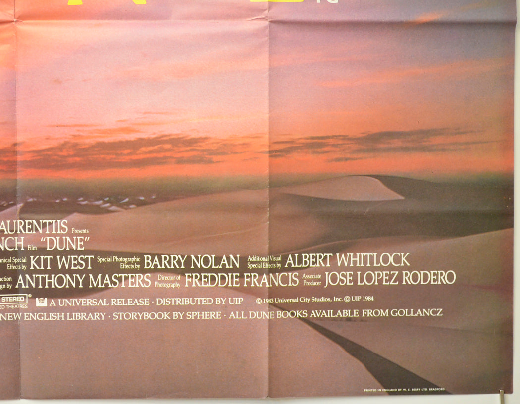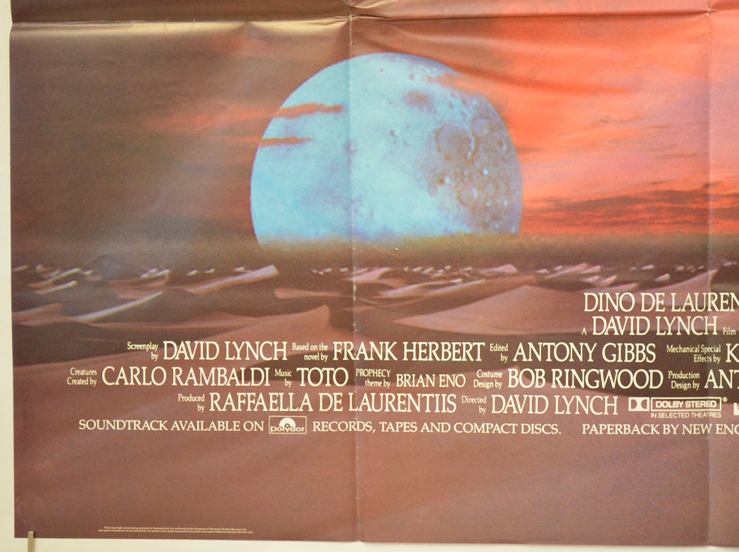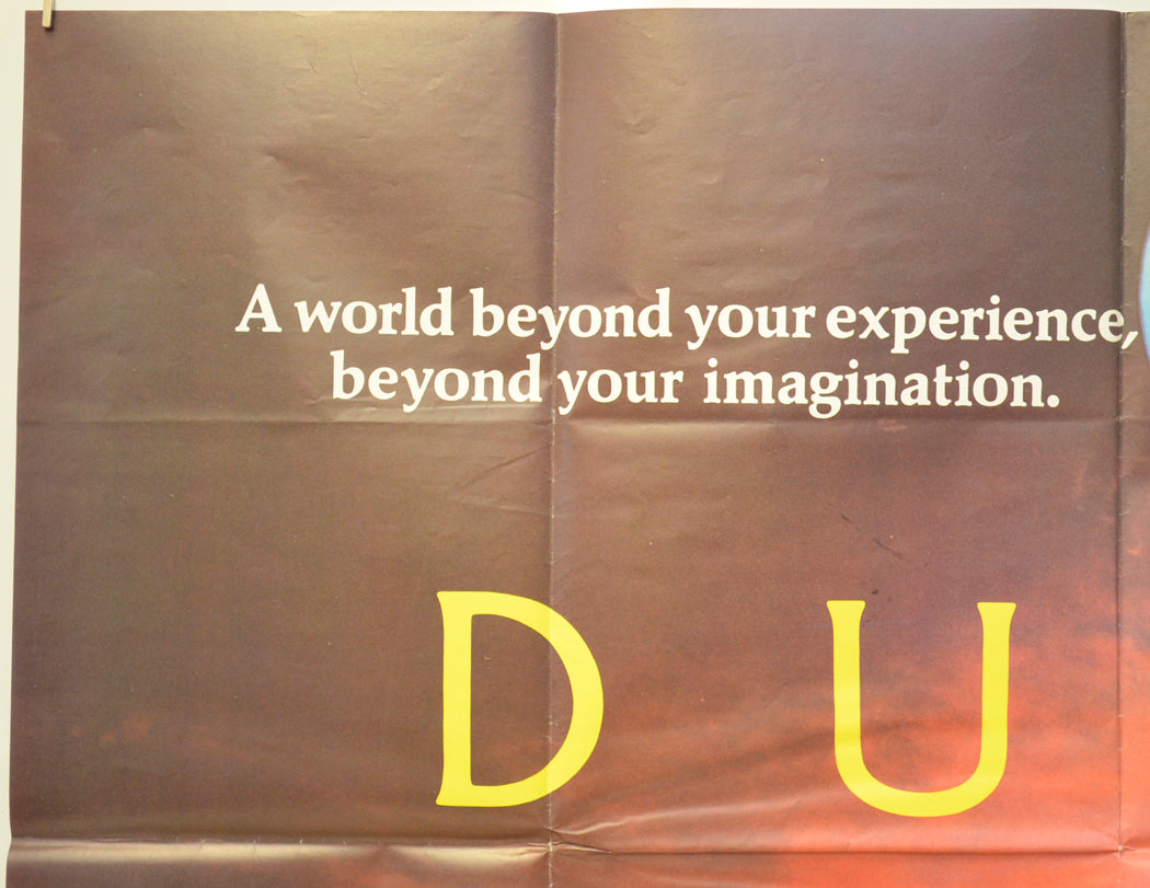 Creasing around some of the fold intersections (note there are three horizontal fold lines), very light diagonal crease from the top of the right vertical fold line across to the right edge, very light surface creasing/wrinkles near the side edges, title written on the back of the bottom edge in Biro (only noticeable on the front if the poster is held up to the light / backlit), otherwise very good!. *Note there are four small dark patches above the “U” in “DUNE” these are within the printing and are on every copy produced.