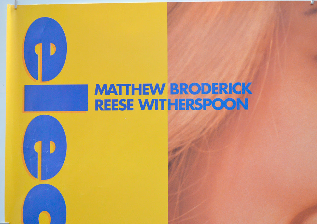 Surface creasing throughout the first 4 inches (10 cm) of the left of the poster including some white stress marks (particularly within the title), 5 cm diagonal crease and a smaller crease across the bottom left corner, tiny tear and mild creasing on the left edge, extremely mild creasing on the top edge, numerous small white surface creases within the first 2 inches (5 cm) of the right of the poster including some white stress marks within Witherspoon’s hair and also near the bottom, mild creasing on the right edge, 7 cm diagonal crease and a couple of smaller creases across the bottom right corner, moderate/heavy creasing/edge wear along the bottom edge, tiny white surface crease within Broderick’s hair, otherwise good.