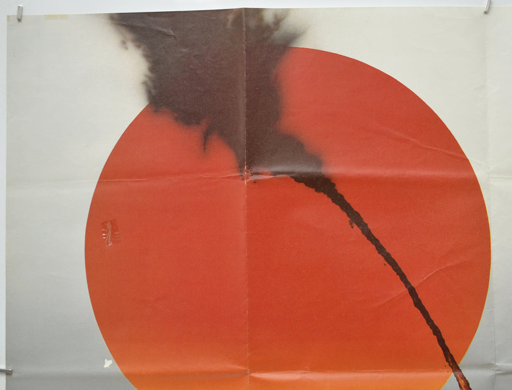 1 cm patch of print loss just left of the sun (just above the center horizontal fold line), 3 x 2 cm patch of Sellotape within the left of the sun, two small patches of tape adhesive staining on the top edge (one near each corner), 1 cm patch of tape adhesive staining on the top right corner and a tiny patch on the top left corner, tiny white print error spot and a tiny dark grey print error spot just above the bottom fold intersection of the center vertical fold line, 9 cm diagonal surface crease and a smaller crease within the right of the sun (going through the fire trail), mild fold wear including additional creasing around and between some of the fold intersections, light surface creasing around the top and bottom edges, 2 cm thin patch of tape adhesive staining on the back of the right of the poster (this has lightly bled through to the front and is just visible near the center of the right edge), small patch of surface paper lift on the back of the right edge (near bottom) and a tiny patch of surface paper loss on the back of the top of the right edge (both are only noticeable on the front if the poster is held up to the light / backlit), otherwise very good.