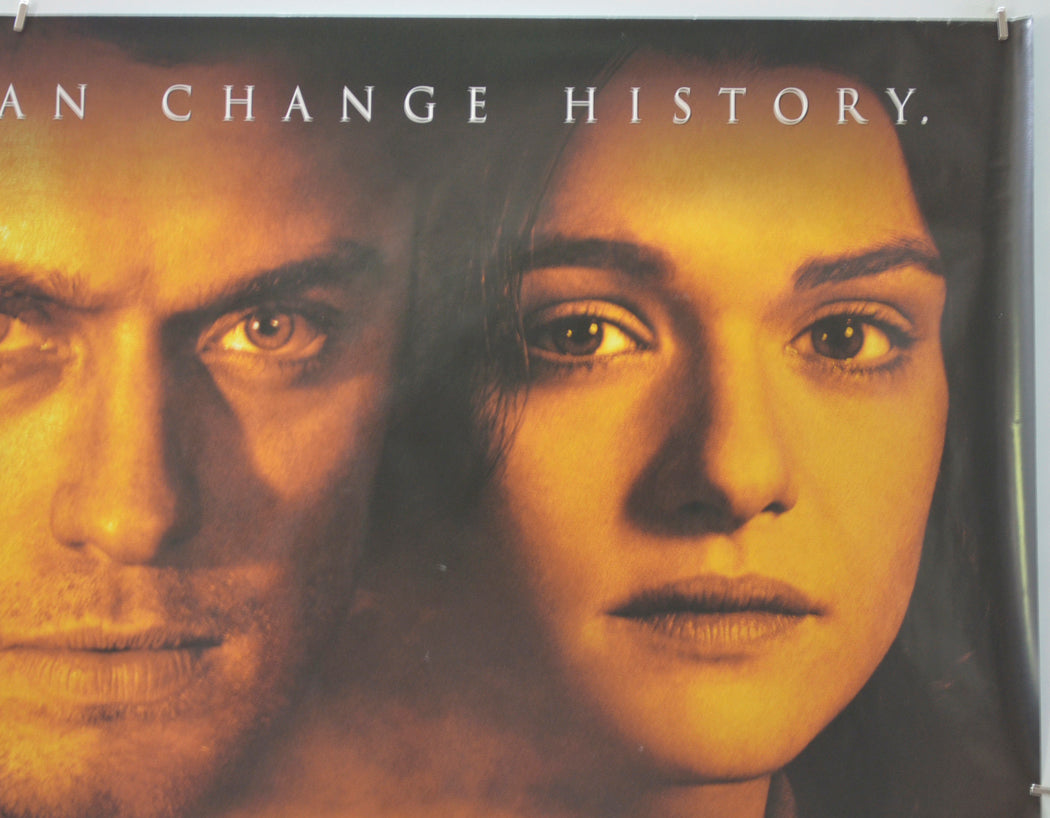 Faint 14 cm thin water stain on the back of the top of the right edge and a 6 cm thin stain on the back of the right of the top edge (only noticeable on the front if the poster is held up to the light / backlit), 2 cm diagonal crease across the top left corner, extremely mild creasing on the top edge, a couple of tiny tears and moderate creasing along with a little edge wear on the bottom edge, approximately six tiny white surface creases near the left edge (above center), two tiny white surface creases between Law and Weisz faces and a tiny crease on Weisz chin, otherwise very good.