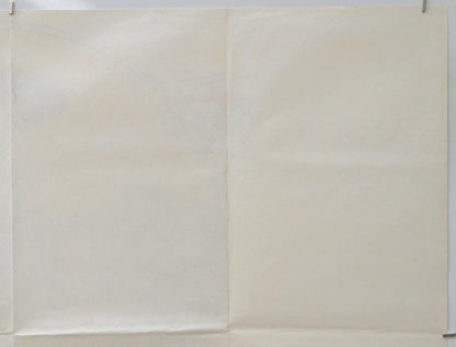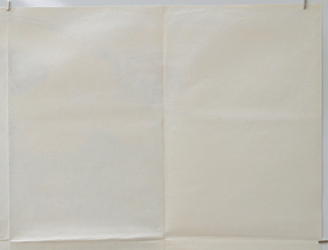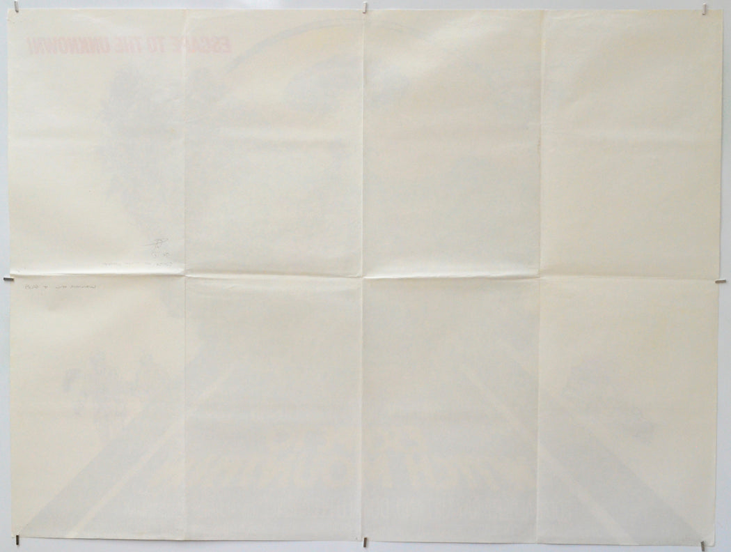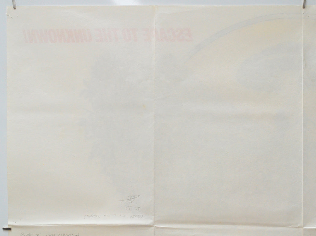2 to 3 pinholes near every corner and the center of every edge (one of the pinholes near the top right corner has torn through to the edge approximately 1 cm, as has one at the bottom center), six pinholes within and just below the hand of the actor within the bushes on the right and another pinhole in the white background to the right of the bushes, three extremely tiny pinholes in the white background above the left foot of the helicopter near the top, 10 cm diagonal crease and a couple of smaller creases just right of the top center going down into the spaceship, extremely mild fold wear (light creasing around the intersections), there is an extremely faint reverse impression of the red title in the white background at the top left (due to the surfaces touching whilst stored folded for many years), otherwise excellent!Double Sided :