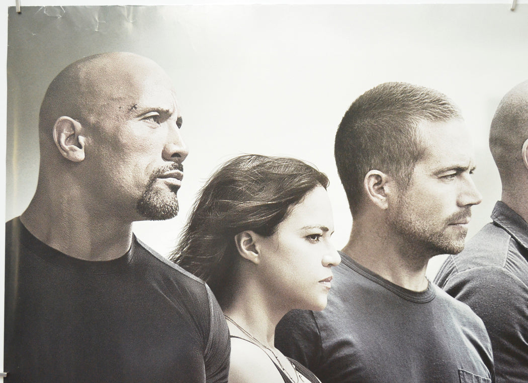 Mild creasing on the top edge including a few small white surface creases just below the edge, a couple of small dark print marks near the top right corner, extremely mild edge wear on the bottom edge, 3 cm crease across the bottom left corner, small white surface crease near the bottom right corner, 3 cm horizontal surface crease on Paul Walker’s chest, some additional light surface creasing around the top left corner area, otherwise good.