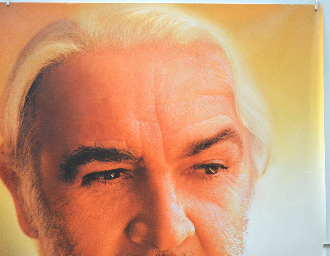 Small tear and mild creasing on the top edge (mostly near the corners), some light surface creasing near the right edge (mostly just above Connery’s shoulder), very mild creasing on the bottom edge, light horizontal band of small creases completely across the poster (going across just below the text at the center and through the lips of the larger image of Connery), some light surface creasing within the first 4 inches (10 cm) of the left of the poster including some white stress marks, otherwise good.