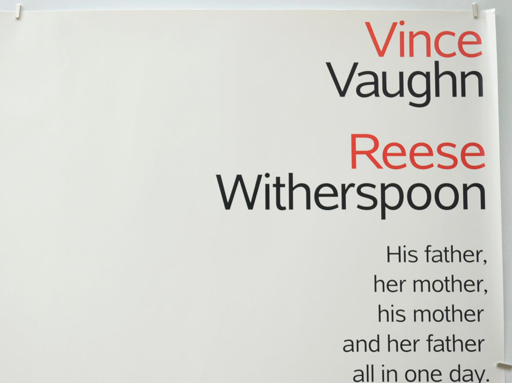 3 cm diagonal crease across the top left corner, approximately 4 extremely tiny tears and very mild creasing on the top edge, 2 cm diagonal crease across the top right corner, a couple of tiny dark print spots? near the bottom of the right edge, approximately 2 tiny tears and very mild creasing on the bottom edge, some light surface creasing on the left including a couple of white stress marks within Vaughn’s body, a couple of small surface creases to the right of Witherspoon’s head, small surface crease above the R in FOUR (some dark print has transferred onto it), otherwise good.