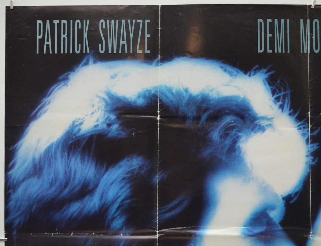Two 4 x 1 cm strips of Sellotape and a 4 cm thin strip of tape with surrounding print loss just right of Swayze’s ear, two 3 x 1 cm strips of Sellotape (one is on top of the other) with a couple of patches of surrounding print loss and additional print loss within the tape (through Swayze’s finger.. at the back of Moore’s neck), 3 x 1 cm strip of Sellotape just above the center of the bottom edge and a similar strip to the right of the bottom of the right vertical fold line, 1 cm diagonal crease across the top right corner, tiny tear and extremely mild creasing on the top edge, a couple of tiny tears and moderate creasing/edge wear on the right edge, three tiny tears and mild creasing on the bottom edge, tiny tear and mild creasing on the left edge, 3 cm diagonal white surface crease and a few smaller creases near the right edge, several small white surface creases near the top edge, 4 cm diagonal thick white surface crease just left of Moore’s chin, the surface is lightly creased/wrinkled throughout, fold wear including white stress marks on all of the fold lines and additional creasing around the intersections (note there are three horizontal and three vertical folds), two pinholes near the top left corner, the back of the center and left vertical fold lines and the back of the bottom horizontal fold line have yellowed (this is lightly visible on the front within the bottom half of the vertical fold and along the bottom horizontal fold in the light areas), otherwise okay.