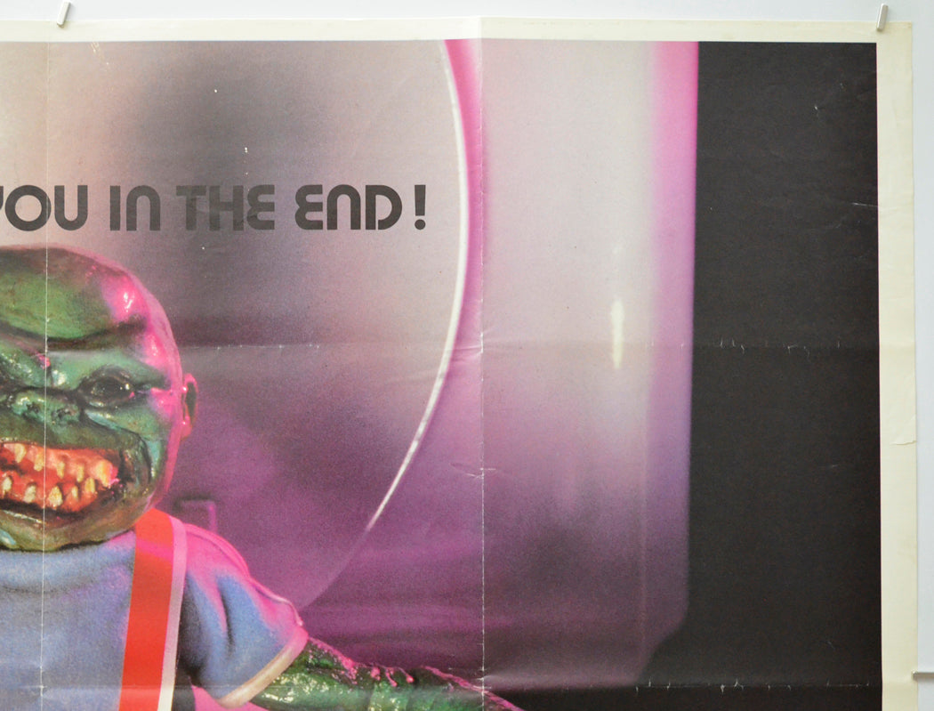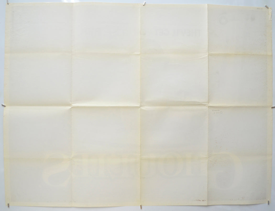 The whole poster has yellowed slightly, moderate edge and surface creasing around the top left corner, 1 cm tear and moderate creasing at the top of the left edge, very mild creasing on the rest of the left edge, 2 cm tear and extremely mild creasing on the right edge, 2 x 1 cm small blue print error patch around the INC. text at the bottom right of the credits block and there is a 5 cm fine red print error line to the right of it, several tiny dull patches in the black background on the left of the poster (this appears to be due to the ink saturating fully through to the back of the poster), ten tiny pinholes (five staples) evenly spaced down the left border, several tiny white print error spots just below the top center and around the THE text near the top center, extremely mild fold wear (light stress marks on some the fold lines and additional creasing around some the intersections) note there are three horizontal and three vertical folds, yellowing to the back of the edges and fold lines and the title has been written on the back of the top edge in black Biro (only noticeable on the front if the poster is held up to the light / backlit), otherwise very good.