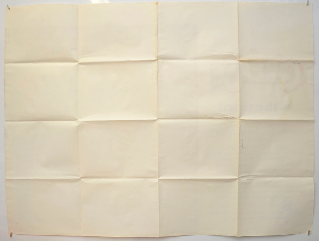 Small Brown stain spot at the top center, extremely faint water stain completely down the back of the left edge (17 cm at the widest point) this has just created a small light patch of Browning within the G of the title and just below it along with an area of patchy black print speckles around the central third of the left edge (The surface of the left edge is a little wavy), creasing around some of the fold intersections (note there are three horizontal and three vertical folds as issued), title written on the back in Biro (only noticeable on the front if the poster is held up to the light / backlit), otherwise very good!